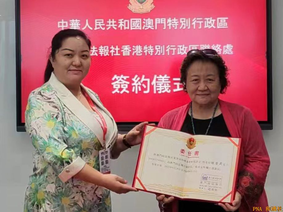 澳门政法报社社长赵海燕为香港联络处主任黄海鹏颁发委任状及许可证。澳门政法报社执行董事长张国柏在签约仪式上为张芳莉颁发副社长、成功女性栏目部部长委任书,他还为李安颁发了顾问委任书。