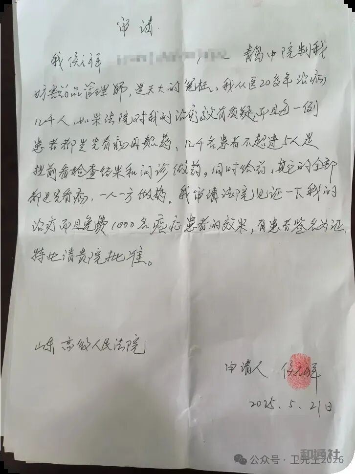 三、 完整证据链:从承诺到实证的逻辑闭环两份证据共同构成了无可辩驳的逻辑体系:敢于承诺(千例治疗申请)能够兑现(狱中明确疗效)接受监督(请求法院全程监督)客观验证(现代医学检验报告)这一完整证据链,将案件的核心问题从”是否构成犯罪”转向了”医术是否真实有效”这一根本性问题。
